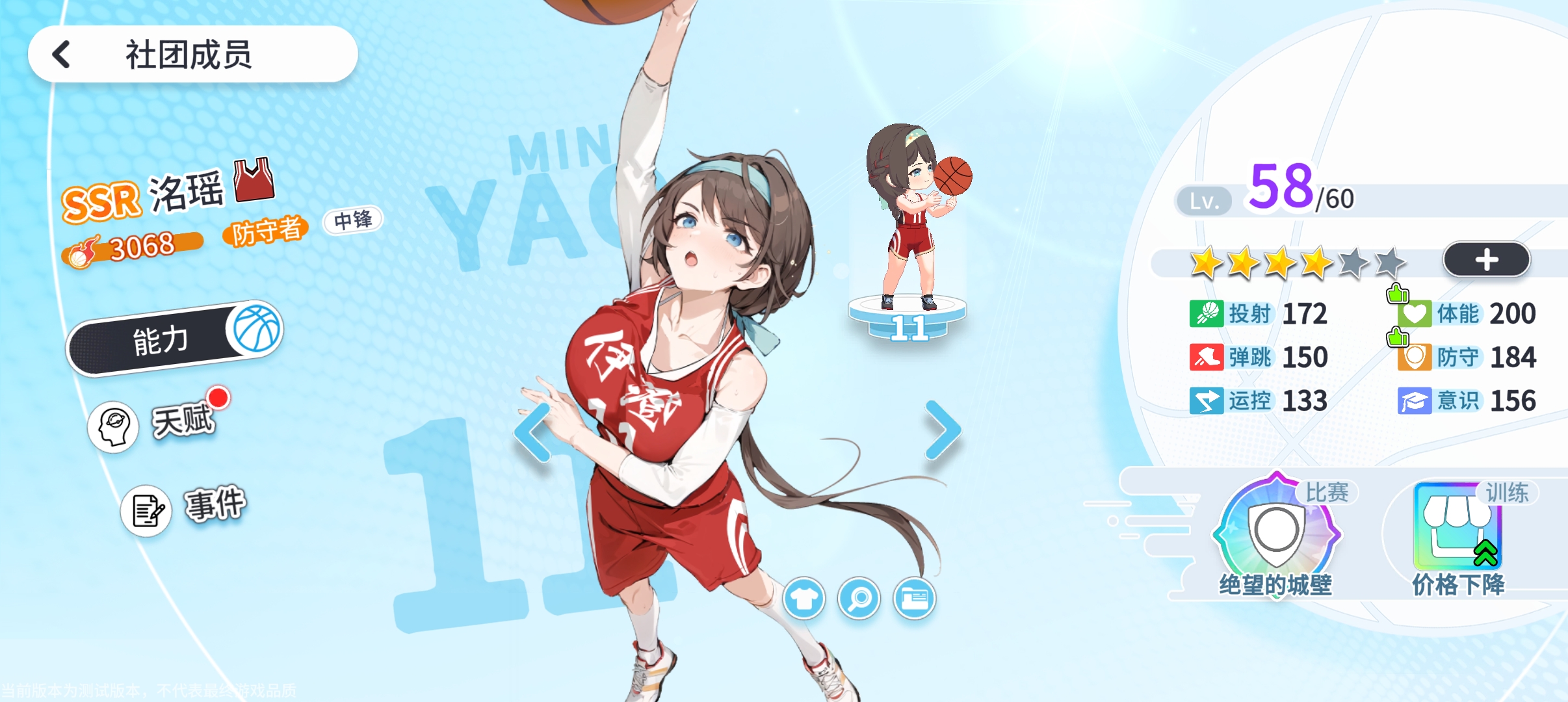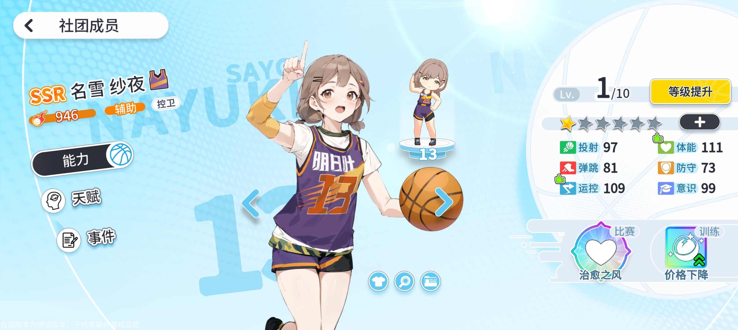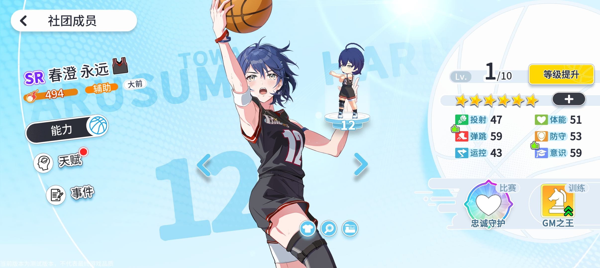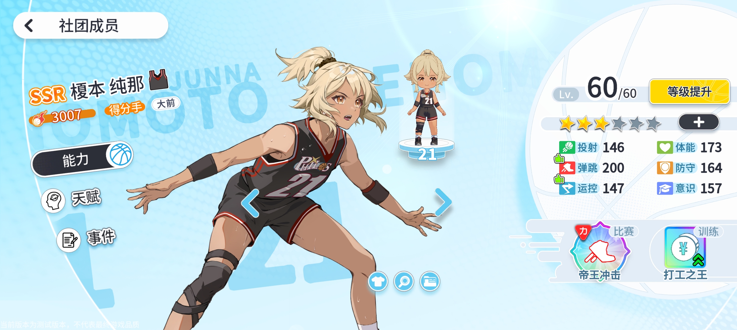 大前上有三个选择:第一张就是榎本,这套阵容选择保底是三火箭加盖帽属性,但是大前上没有一张好的火箭卡而且盖帽属性可以说只对中锋有效所以不用开五火箭,选择榎本提升全队5%看穿,第二个龙宫,大招命中三分喜欢魔球的可以带龙宫+克拉丽丝,魔球打法,第三个春澄,作为主攻手对体能的要求是非常严格了,且防守是会掉体力的猜拳输了后,分位这个位置是体力要求最大的,春澄的大招可以大量回复哈登的体力