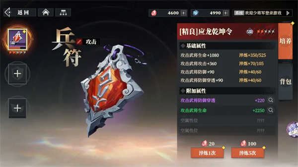 兵符分为攻击、防御、辅助兵符,每种兵符有六阶,打造品阶上限随少将军等级而提升。装备后,少将军可以通过兵符强化石对兵符进行强化,强化至上限后还可使用归元花对兵符进行升星,进一步提高基础属性以及淬炼上限。
