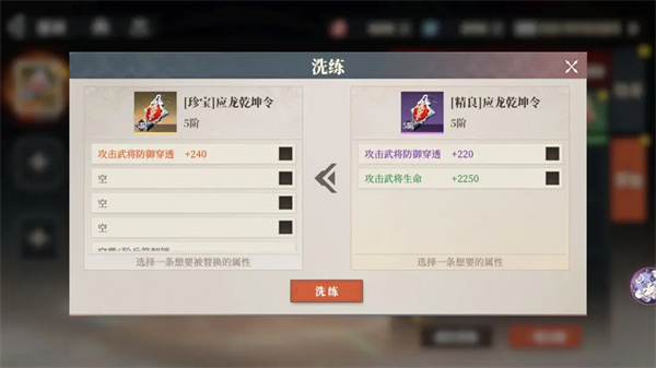 兵符带有基础属性与附加属性。基础属性会为兵符对应职业的武将带来属性加成,附加属性会为对应职业或全局带来属性加成。兵符等阶越高,穿戴时可以装备的附加属性词条数量越多。鉴定后的兵符会自带一条同品质附加属性词条,可以通过洗练转移至装备兵符上(不可同时装备相同的附加属性词条,但是可以将其从低属性洗炼为高属性)。