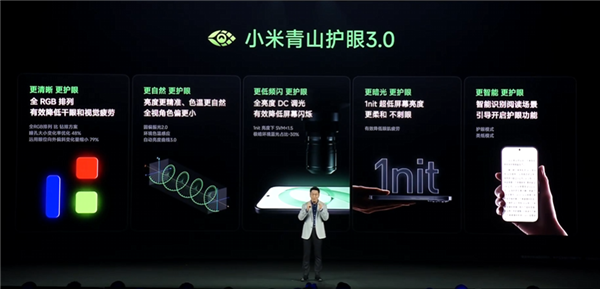 护眼方面升级到小米青山护眼3.0,通过莱茵硬件级低蓝光、节律友好、无频闪三重认证及中国质量认证中心视觉健康友好度St+认证,有效降低视觉疲劳。
