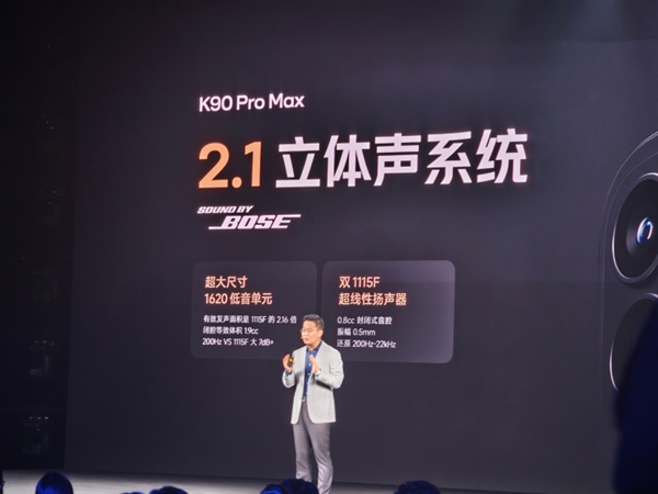 据悉,REDMI K90 Pro Max配备两颗1115F超线性扬声器+超大尺寸1620低音单元,实现低音饱满、细节丰富、人声清晰,并由REDMI和Bose联合调音。