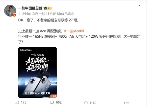 李杰表示,一加Ace 6是同档唯一能在主流游戏里实现60/90/120/144/165满帧玩,同时也做到主流手游最好的1% Low帧表现。超高帧的性能表现和游戏体验不仅是同档最强,也是同档唯一,一加Ace 6把性能这件事,做得纯粹,做到彻底。