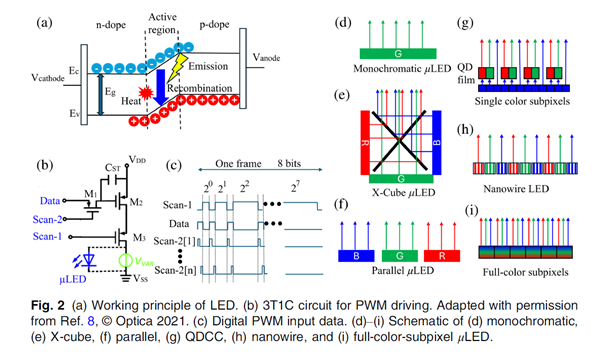 图片:LED工作原理,以及实现全彩Micro-LED的几种方式,其中(e)采用的合色棱镜是当前主流方式,(f)单片集成三色还处于早期研发阶段。