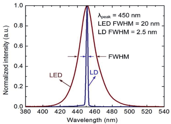 LED的带宽比较宽,通常在~30 nm,比如绿光LED,其典型的发光光谱大致在520 nm±15 nm的范围。而激光的带宽就非常窄,可以达到~2nm,有的甚至可达到0.1 nm以内。
