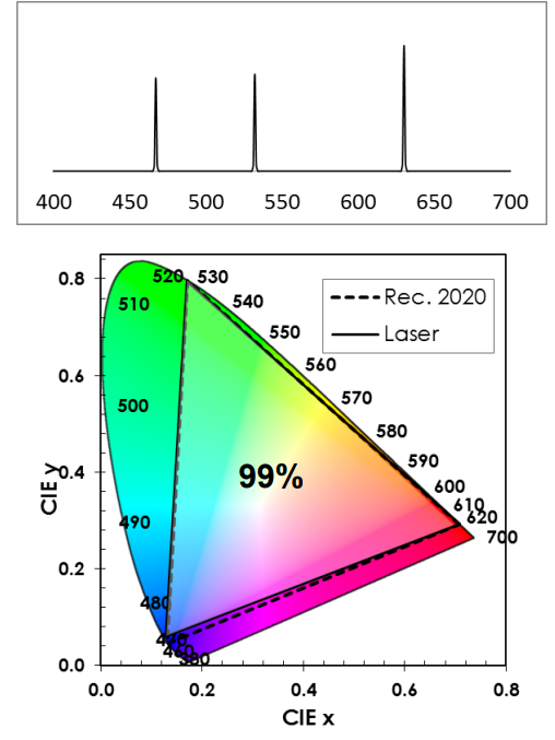 激光的光谱带宽很窄,这意味着颜色更加纯净,通过RGB三色合光,能够覆盖更加宽广的色域。例如激光显示覆盖的色域接近甚至超过BT.2020标准(>90%),而普通LCD通常只能覆盖sRGB或部分P3。