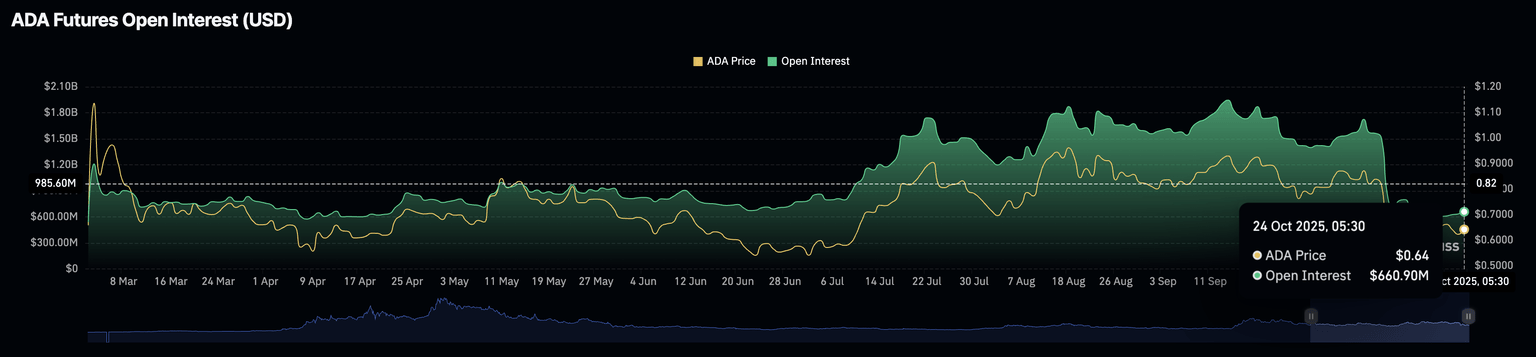 除了链上持有者之外,衍生品市场也显示出杠杆驱动的卡尔达诺交易者缺乏投入。CoinGlass 数据显示,ADA 期货未平仓合约 (OI) 为 6.609 亿美元,高于周四的 6.3594 亿美元,在 10 月 10 日暴跌后,持平于 7 亿美元以下,低于 15.1 亿美元。未平仓衍生品合约的名义价值 OI 停滞不前,表明交易者存在避险情绪,他们选择采取观望态度。