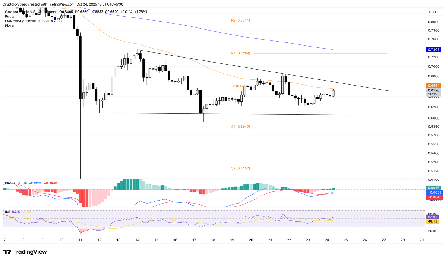 卡尔达诺从局部支撑趋势线反弹,并在4小时价格图上完成了下降三角形形态。截至撰写本文时,ADA在50周期指数移动平均线(EMA)0.6554美元处面临阻力。