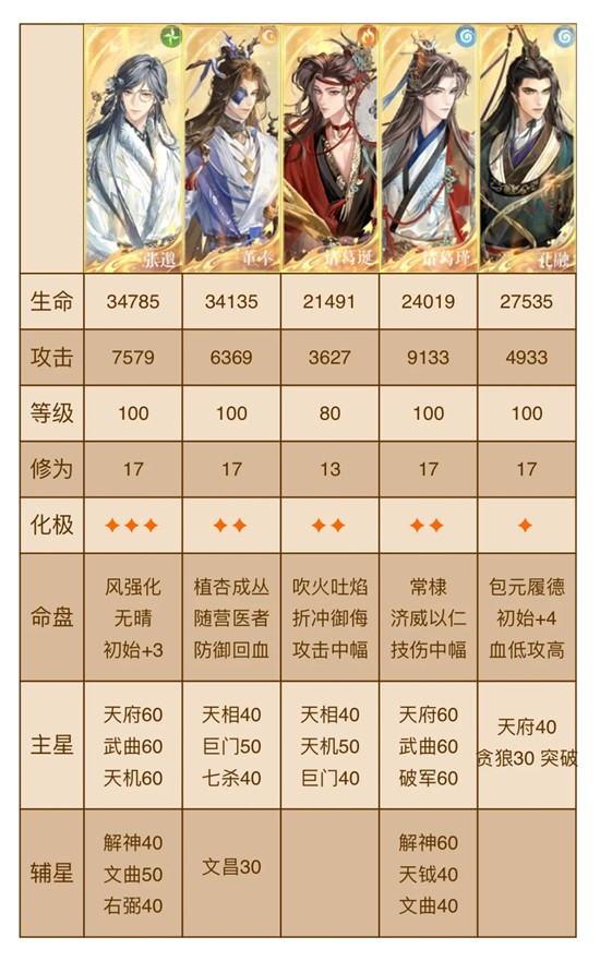 2. p4我的练度图里,如果有养了阴煞辅星,建议把诸葛瑾的文曲替换成阴煞,如果有养了天巫辅星,建议把张邈的解神换成天巫,孔融可以装攻击星石,这样伤害更高