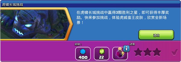 1、春节将至,挑战来袭。虎啸长城挑战活动限时开启中。携手虎威蛮王参与挑战活动,提前参观全新村庄场景,豪取三星胜利,喜提丰厚奖励!