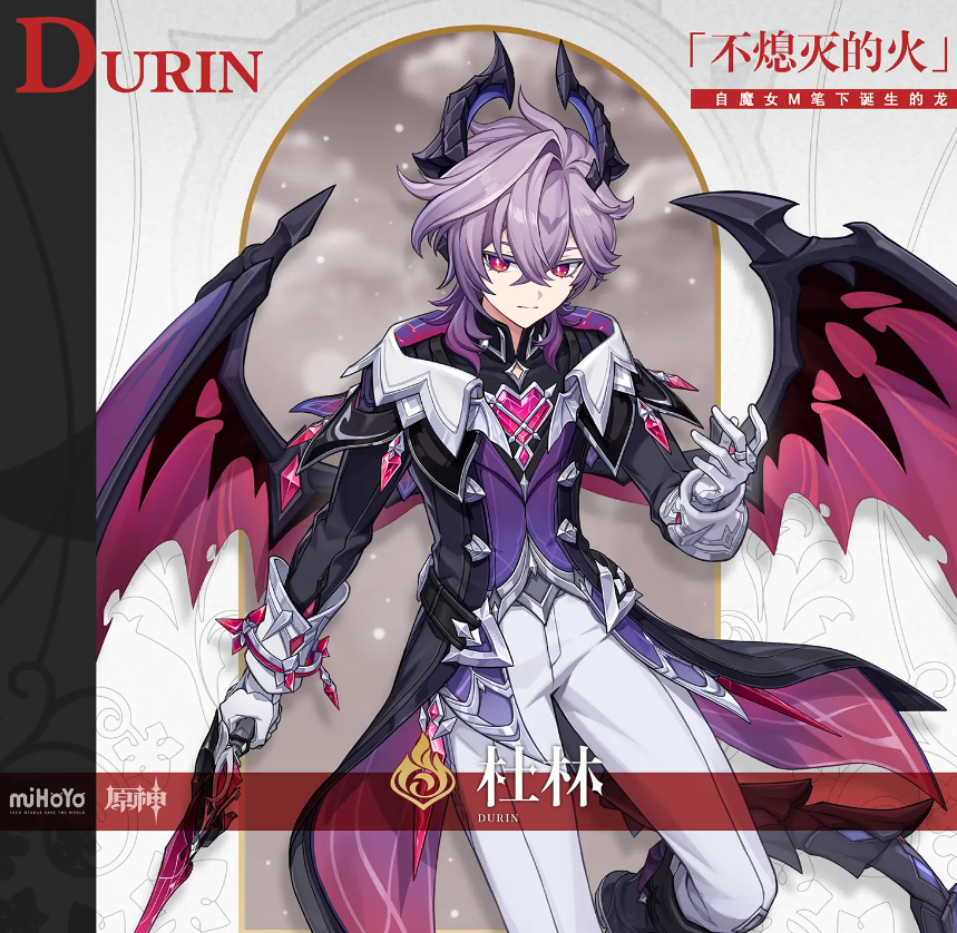 杜林是一名五星火元素单手剑使用者,其普通攻击可进行最多四段的连续斩击。在施放元素战技时,若处于“白化状态”,则会召唤出白焰龙形态,向前方区域释放三次火元素范围伤害,并使白焰龙进入协同作战模式。