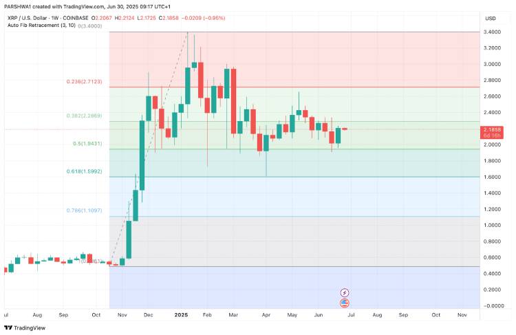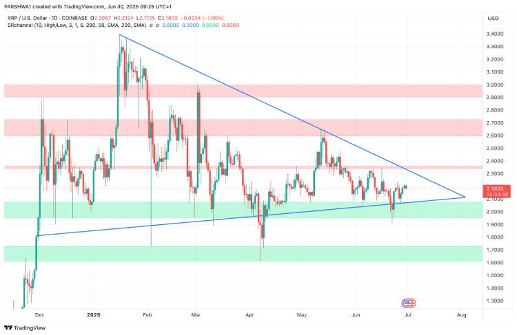 技术面看跌:日线形成“倒 V 形”结构,预示可能再跌 20% 至 1.70 美元;周线 RSI 出现看跌背离,暗示长期上升动能衰竭;衍生品市场收缩:期货未平仓合约量波动剧烈,反映投机资金撤离。瑞波币 (XRP) 6 月份收盘价约为 2.18 美元,此前曾从月初低于 2 美元的水平回升。瑞波币价格目前位于主要阻力位附近,而更广泛的对称三角形形态表明,7 月份瑞波币突破的可能性很高。