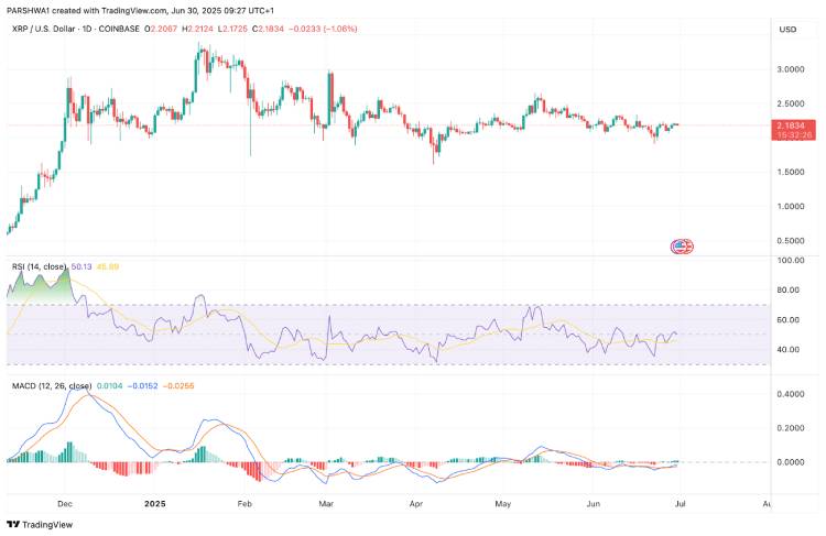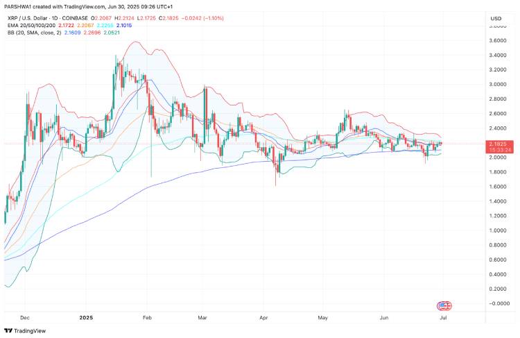 瑞波币目前在 20 日指数移动平均线 2.17 美元附近徘徊,而 50 日指数移动平均线 2.22 美元则构成上方阻力。100 日和 200 日指数移动平均线位于 2.01-2.06 美元附近,构成支撑位,这意味着 7 月初的任何回调都可能重新测试这些区域。