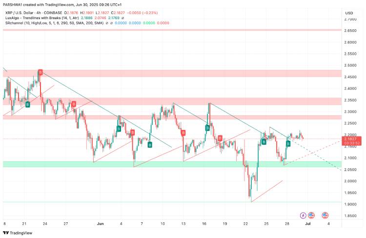 在更高的时间范围内,XRP一直在斐波那契水平 0.382 和 0.618(2.28 美元 - 1.59 美元)之间盘整,价格走势保持相对中性。这些水平的汇合,加上日线图和四小时图的压力,增强了 7 月份突破趋势的可能性。