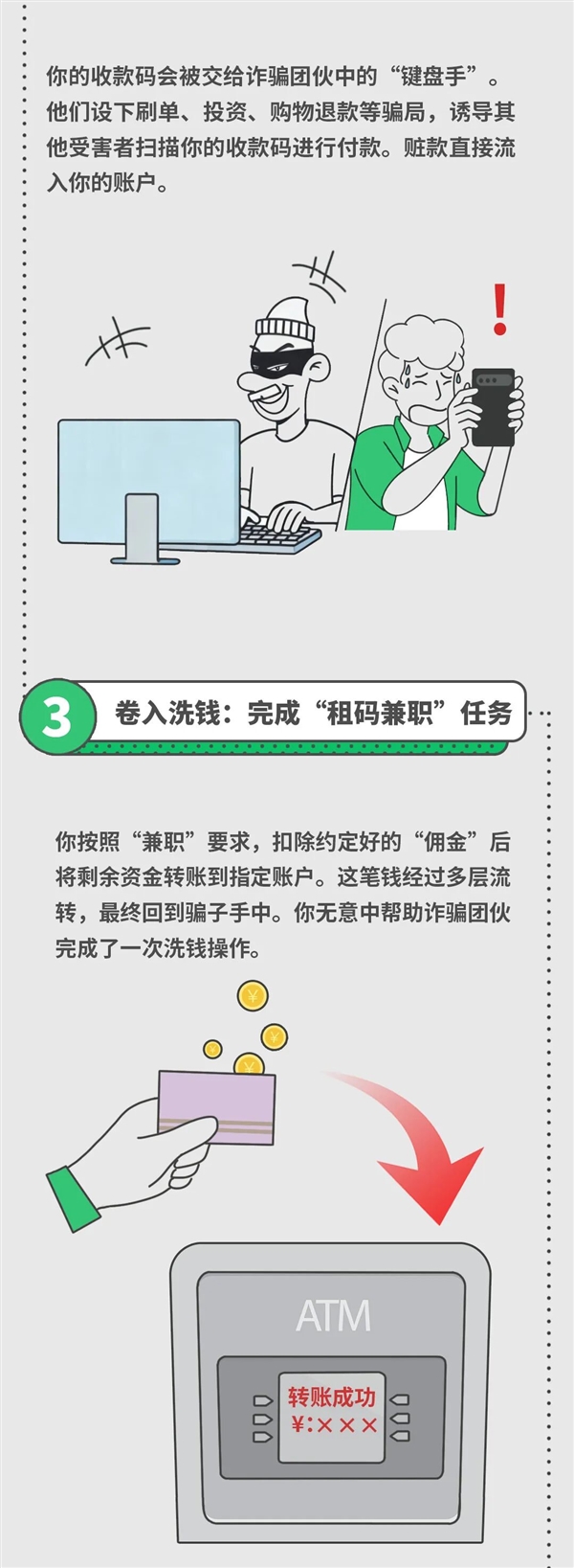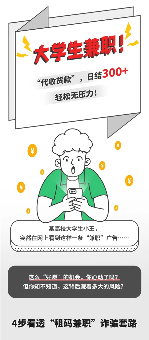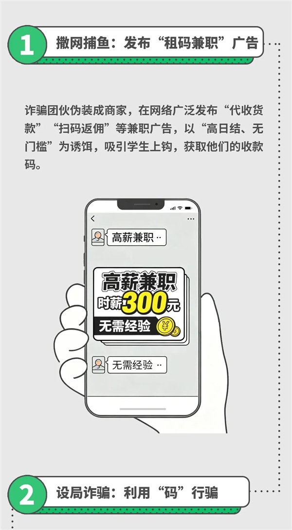 第一步,诈骗团伙伪装成商家,在网络上广泛发布“租码兼职”广告,以高额佣金为噱头吸引目标人群,获取其收款码;