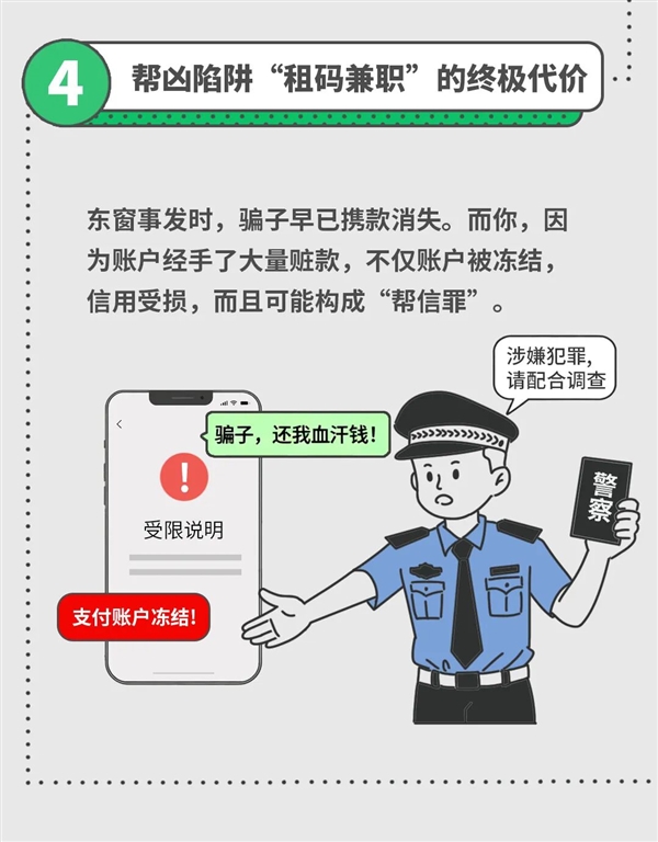 第四步,东窗事发时,骗子早已携款消失,而租借者因账户经手赃款,不仅会被冻结账户、损害信用,还可能构成“帮信罪”。