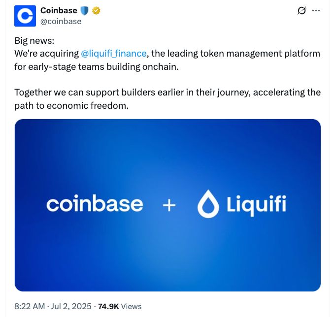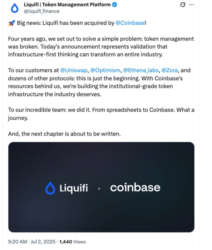 美国主要加密货币交易所Coinbase延续了2025年的收购热潮,收购了代币管理平台Liquifi。