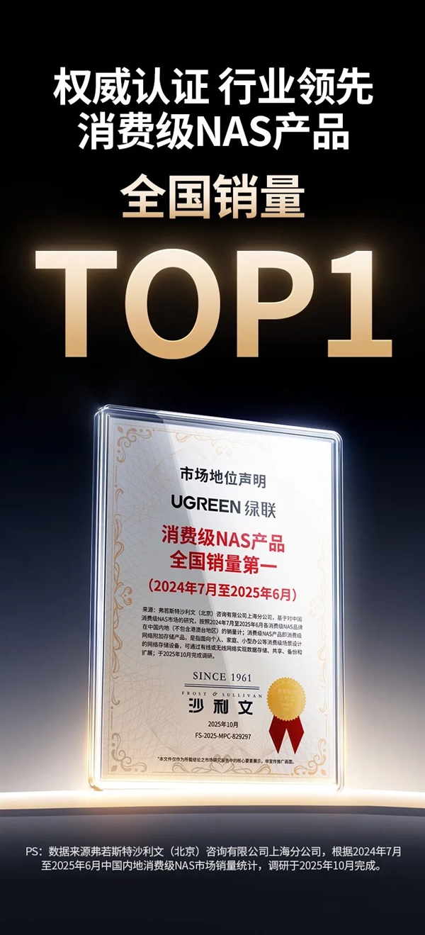 这一结果来自沙利文基于《全国数据资源调查报告(2024)》的独立调研和数据评估,根据2024年7月-2025年6月中国内地消费级NAS产品市场销量统计。