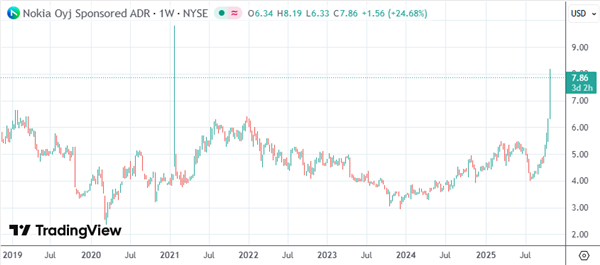 受该消息影响,诺基亚美股日内一度涨近30%,最高报8.19美元,创2021年1月以来的最高水平。截至收盘,诺基亚收涨22.99%,报每股7.779美元。