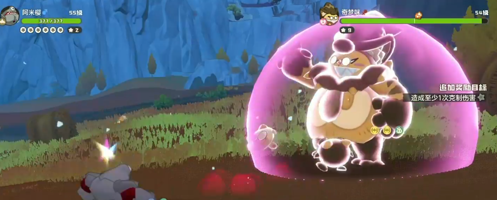 奇梦咪拥有“鼓气”特性,当其使用消耗为3点能量的技能时,自身的攻击与防御将永久提升10%。作为一只萌系首领精灵,它会在玩家踏入其领地后立即发起进攻。该BOSS具备5层护盾,在战斗初期会悬浮于空中并对玩家发动冲撞攻击,同时在空中持续施放远程打击。