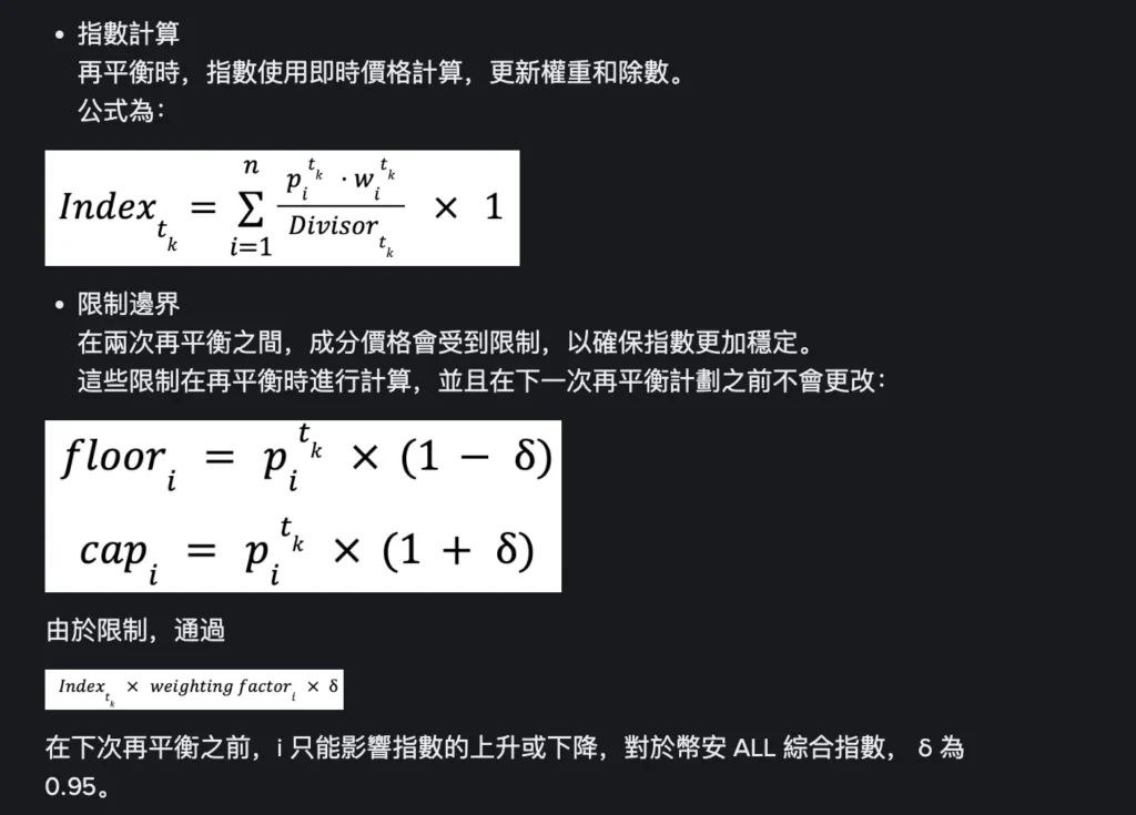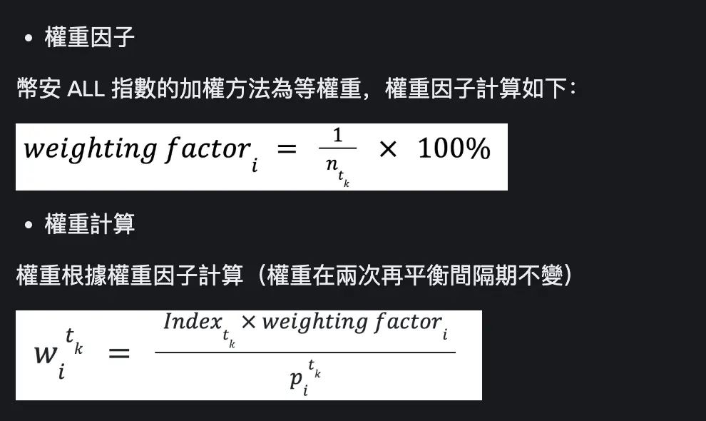 币安ALL 综合指数根据其成分的加权平均价格计算,以下将参考币安公告的解释说明,综合指数采用等权重加权模式,意即每个成分代币无论市值大小都占有相同权重,可以更显现平均表现,也能避免高市值代币如SOL、XRP 垄断影响,但同时也相对放大了小市值代币剧烈波动对指数的干扰。