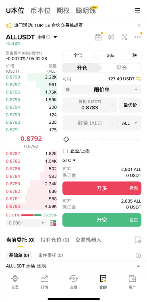 上述说到ALLUSDT 的资费计算方式和大多USDT 计价永续合约相同,为8 小时结算一次资金费率,并有着±3% 的资费上下限。在行情极端偏多/空的情况下,可以利用反向仓位的短线策略去对冲套利,还能收取资金费率。