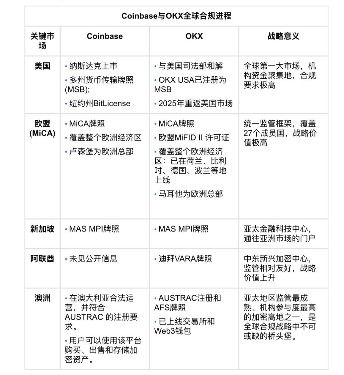 在全球牌照布局上,OKX持了有欧盟MiCA牌照、新加坡MPI牌照等高质量许可,并在美国进行MSB注册与合规重建,且业务不断向发达市场集中,甚至可与Coinbase媲美。此外,两家交易所在均已在全球多个重要地区获取关键牌照,差距逐渐缩小。