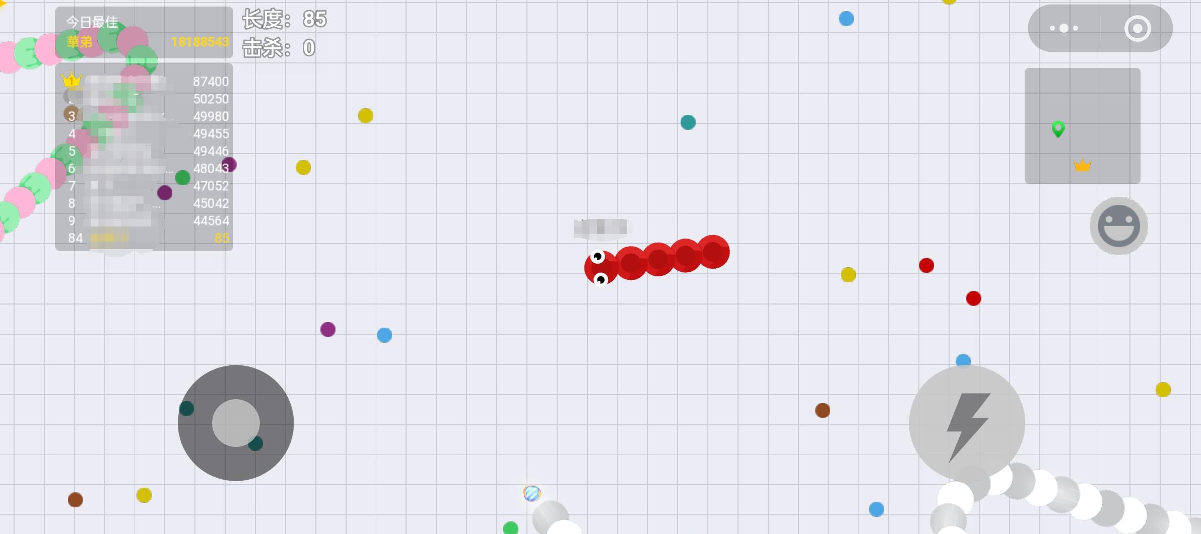 地图上分布着大量彩色的小圆点,这些就是可供吞噬的食物。每吃掉一个食物,蛇的身体就会增长一节。同时,地图中也会有其他玩家操控的蛇存在。如果能够巧妙地引导对手撞上自己的身体,对方就会立即死亡并分裂成多个食物点,此时迅速靠近吞噬便可快速增强实力。反之,若自身头部撞到其他蛇的身体,则会直接被淘汰,并留下大量食物供他人拾取。