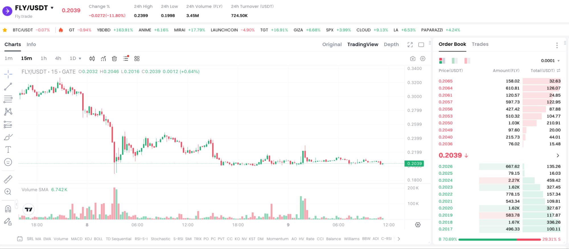 在 Gate 交易所,FLY 永续合约提供高流动性与灵活交易选择。当前现货价格为 $0.1111,24 小时交易量达 165 万美元,流通市值约 273 万美元。Gate 此前已上线 FLY Launchpool,用户通过质押 BTC 或 GT 可分享 444,444 FLY 奖池,其中 BTC 池预期年化收益 2.40%,GT 池达 9.85%。