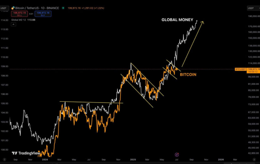 BTC/USD与全球M2货币供应。来源:Cointelegraph/X