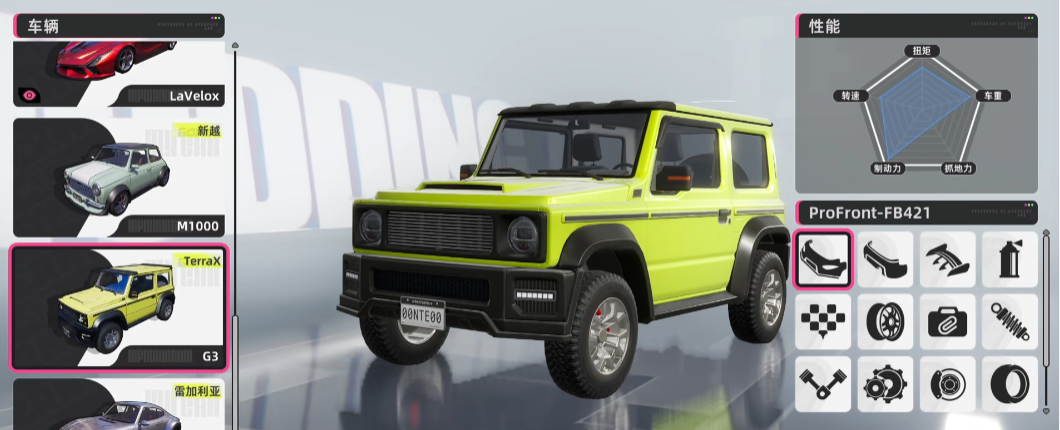 竞速型车辆仅在限时活动赛事期间开放获取,配备专属涂装及特殊配件加成,视觉效果极为出众,尤其在夜间行驶时伴有动态流光特效,极具观赏性,通常适用于野外高速驾驶场景;至于展示型车辆,则仅在商城中上架出现;