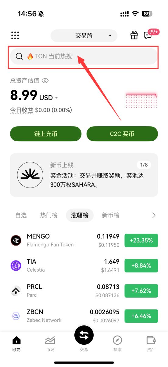 2、注册完成之后,下面打开欧易app(官方下载),点击页面上方的搜索框;