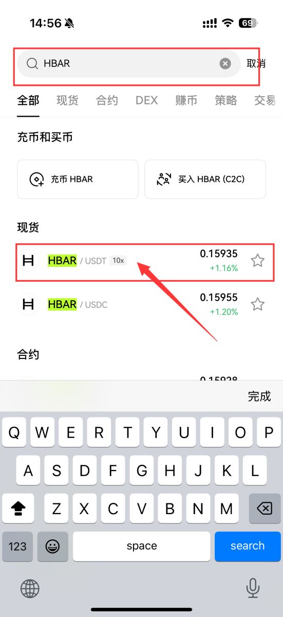 3、输入【HBAR】,这时下拉会显示现货HBAR/ USDT,点击【HBAR/ USDT】。