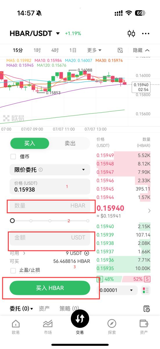 5、依次选择【限价单】-购买【价格】-购买【数量】-【成交数量】,设置好之后,点击【买入HBAR】。