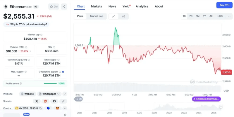 截至 2025 年 7 月 4 日,以太坊交易价为 2,555.31 美元,过去 24 小时内下跌 1.54%。