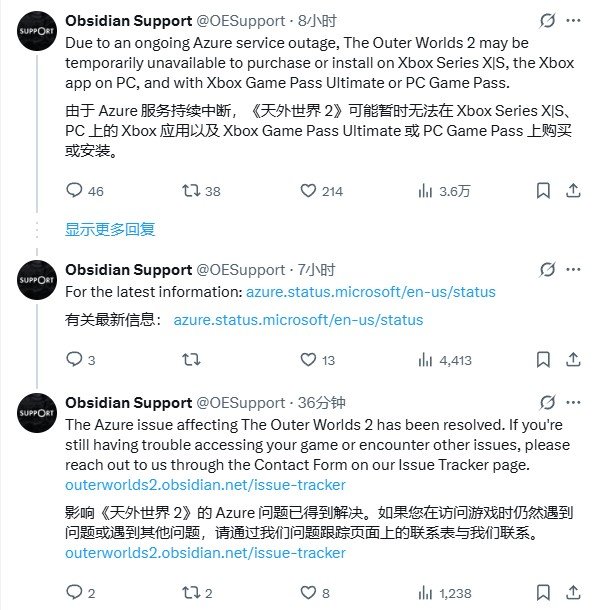 “由于持续中的Azure服务中断,Xbox Series X|S、PC版Xbox应用、Xbox Game Pass Ultimate及PC Game Pass用户可能暂时无法购买或安装《天外世界2》”,开发商黑曜石娱乐在社交平台发文表示,“我们正与微软协力解决问题,获得进展后将向玩家同步信息。”