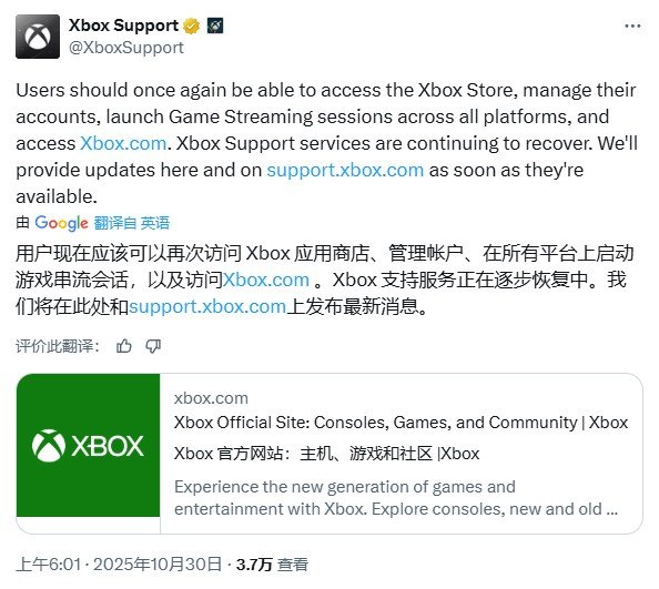 截至北京时间2025年10月30日上午6:01,微软表示Xbox服务现已恢复正常运行。