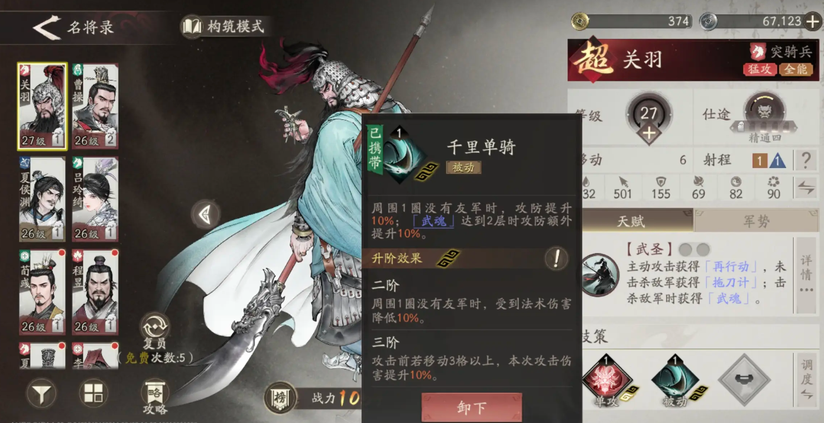 即使未完成击杀,该技能也有概率施加“缴械”状态,使敌人无法进行普通攻击。进一步升阶后,若在具备2层武魂的情况下成功击杀对手,技能冷却将被完全清除。技能满级后,还能根据战前移动的格数,最高提升15%的伤害输出。“单骑”技能则在周围无队友时,提升自身10%的攻击与防御,当武魂达到2层时,此增益效果翻倍。