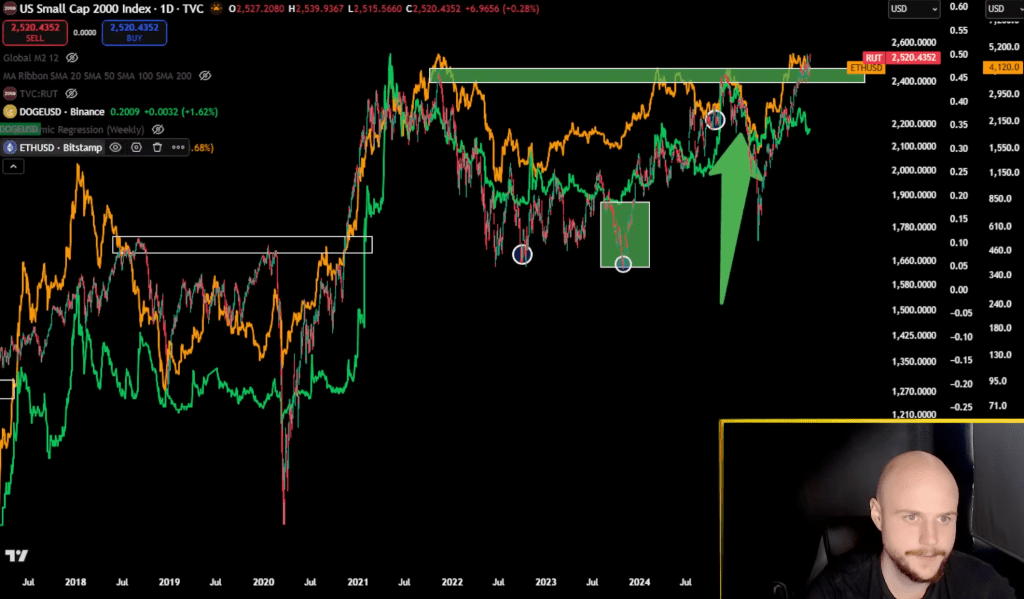 他将这种动态比作标普500指数的“蓝色圆圈”反弹,并预期比特币也会出现类似的移动平均线反应,以维持加密货币风险周期的完整性。以太坊被视为小盘股走强的受益者,同时也是山寨币轮动的验证者:“如果标普500指数和罗素2000指数都能走高,那就为以太坊开了绿灯。如果以太坊走高,那么狗狗币也可能走高。”