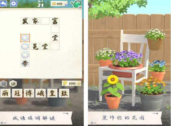 这是将故事加入了成语填词的玩法,因为你将成为从城市回老家的可爱女孩子,在经营奶奶花园的过程当中,想要使每个漂亮的花朵顺利的开放,必须要通过不断闯关的方式来获得水滴,在关卡中就是会显示出不同的文字。如果能利用填词,使成语成立的情况下,就可完成闯关的任务,得到了金币以后,也能购买花盆以及其他的道具。