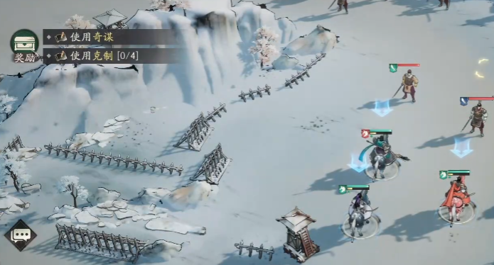 地图整体范围较大,但实际战斗区域较为集中。左侧区域无需过多关注,重点应放在右侧的额外奖励目标上,达成条件包括完成四次属性克制并使用奇谋技能。开局阶段推荐立即启用“一鼓作气”奇谋,该技能可为全体己方单位附加战意状态,使其在首回合即可释放战法,抢占先机。只要使用上述推荐武将,属性克制效果便可自然触发。