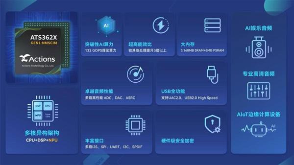 炬芯®端侧AI音频芯片ATS362X已在品牌客户音频产品中立项落地,深度融合低功耗设计的深厚积淀与端侧 AI 的创新技术,凭借6.4 TOPS/W 的超高能效比,可支持声纹识别、环境音分类等复杂模型在端侧实现实时推理。这一特性让音频设备在搭载强大 AI功能的同时,仍能维持超长续航,轻松满足全天候使用需求,为各类电池驱动设备提供稳定可靠的性能支撑。