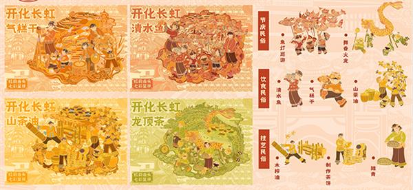 此次比赛特等奖的获奖团队,来自浙江师范大学的团队带来的七彩呈祥系列作品,围绕长虹乡气糕干、清水鱼、山茶油等系列生态农产品进行包装设计。“我们团队深入走进本地了解状元文化、星空文化、民俗文化、建筑文化等多元文化,依托阿里云PAI-ArtLab平台的AIGC技术和云工开物算力资源,聚焦产品外观设计领域,投入农民画风格参考图,结合开化长虹乡主题让AI生成类似风格插画元素,最终形成贴合需求的包装插画,完成系列农特产品的包装升级。”