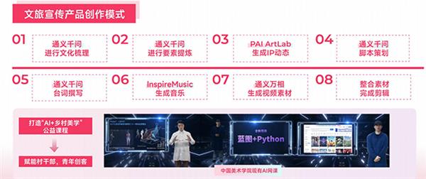 “我们通过暑期走进长虹,深度了解本地文化,以开化县长虹乡‘源头活水’为精神脉络,制作出专属于开化的全新音视体验,团队借助阿里云百炼平台构建工作流,将‘开化青年’吉祥物化作“长虹生活体验官”,在歌词叙事中融入‘七彩长虹’文化密码,同时RAP部分串联长虹十大特色农产品,在‘浙YOUNG游’的青春视角下,构建出一幅“学在长虹、吃在长虹、行在长虹、住在长虹”的全景式乡村生活图鉴。”获得一等奖的中国美术学院团队代表介绍道。