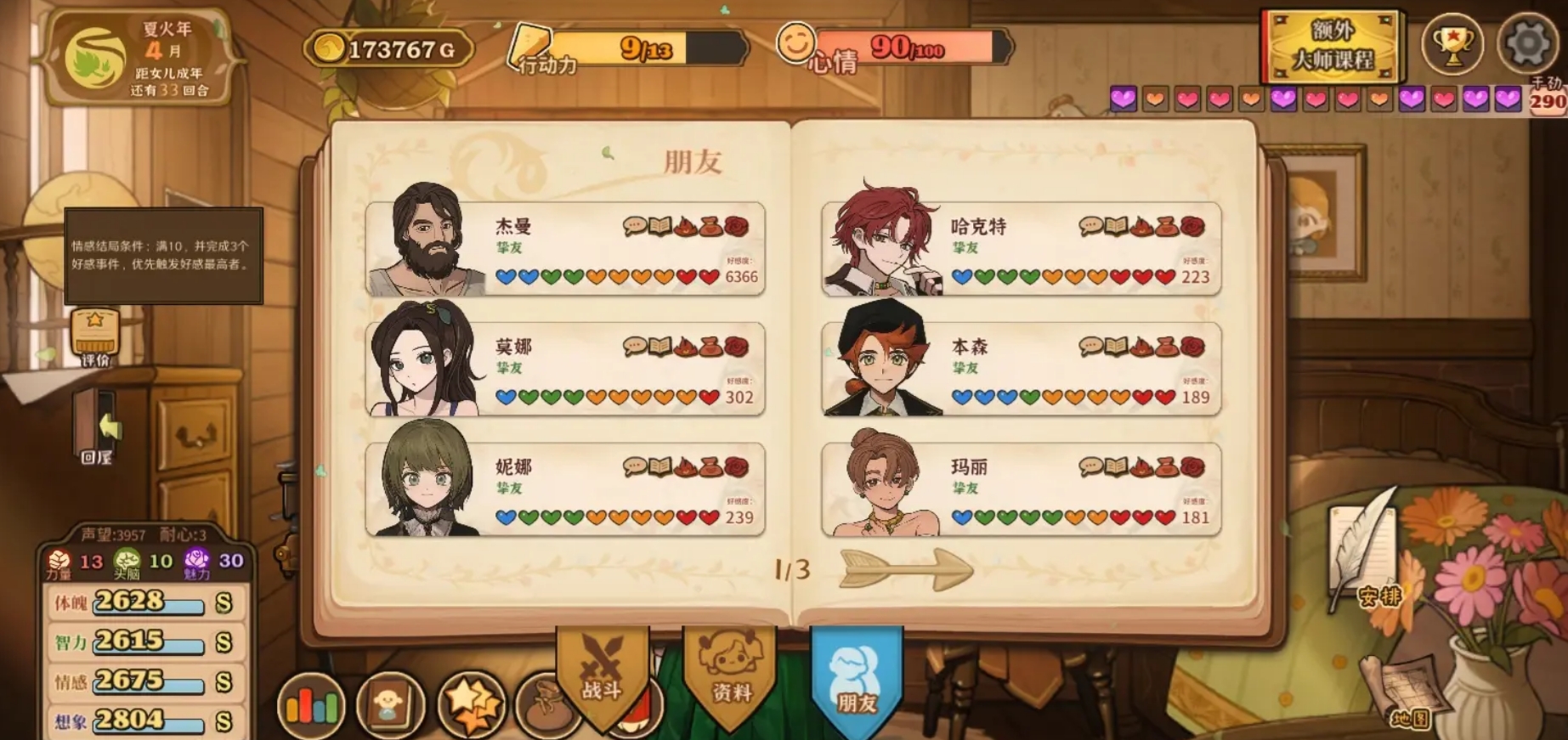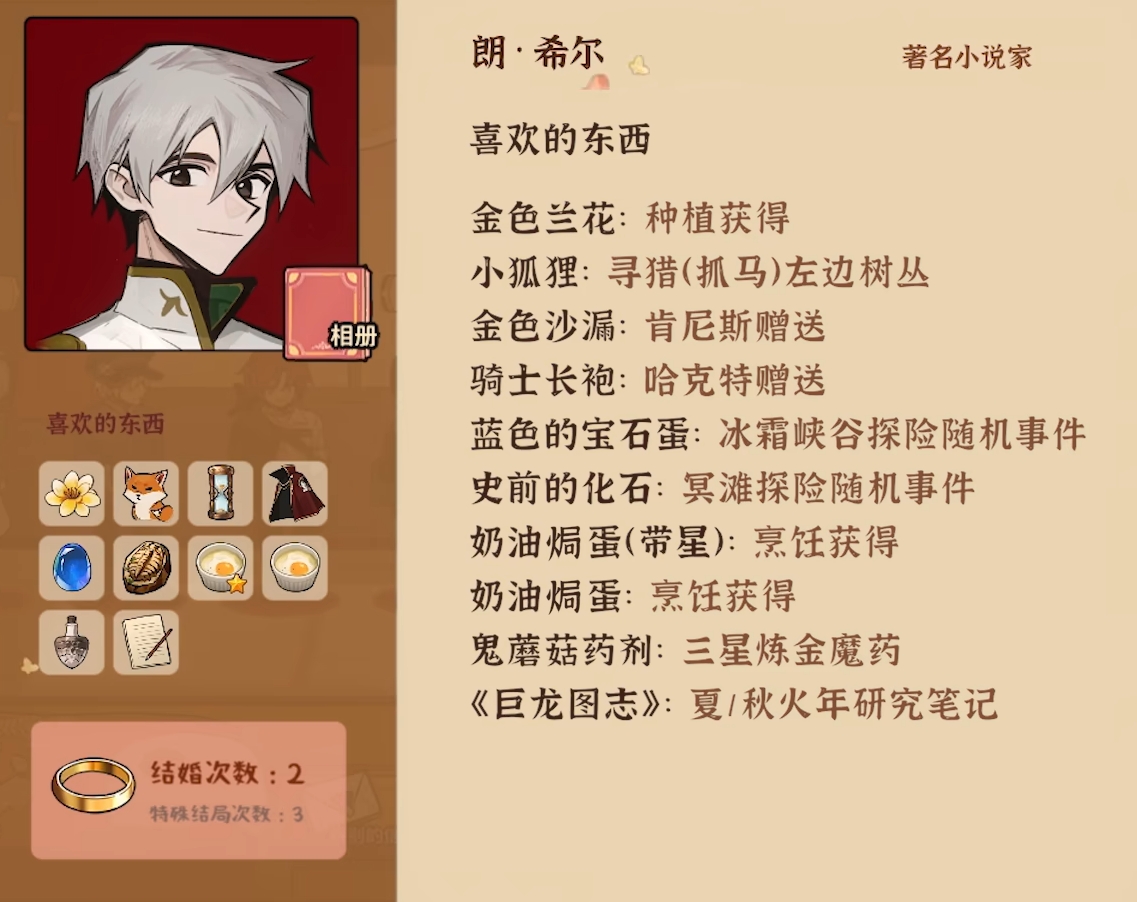每次送对礼物后,NPC的介绍里也会同步更新他的喜好信息,并会给出该礼物的出处,方便各位去寻找,且所有NPC对女儿的好感值都能在“朋友”中查看,他们头像旁边的爱心会随着好感值上升而点亮,全部点亮后还可通过继续赠送礼物继续提升好感值。倘若各位想快速将某一位NPC的好感刷高,最好的方法就是在找出该NPC所喜欢的礼物后,只去制作那些可重复获取的礼物,并把这些礼物都送给对方。