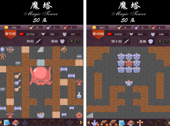 游戏当中涵盖24层以及50层的魔塔环境,由于每一层当中都会遇到很多危险的事情,所以必须要在探索的过程当中,有超强的战斗实力。也是根据经典的魔塔游戏所改编而来的,不同版本高度还原了这种游戏所具备的玩法以及特色,你需要在探索的过程当中不断的提升自己的战斗力,这样才有机会完成挑战,将敌人打败。