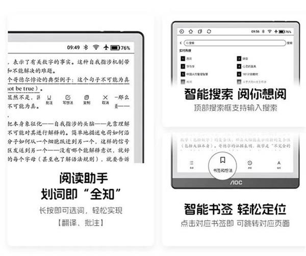 当秋风渐起、冬雪纷飞,AOC小Q MAX阅读器8R1的冷暖双前光调节功能显得格外贴心。从清晨的第一缕阳光到深夜的温暖灯火,自由调节的前光让阅读氛围与季节完美融合。基于AOC系统级深度开发的京东读书app,让您在寒冷的冬日里畅享60万+精选电子书的温暖陪伴。新增PDF文档重排功能让学习资料在任何光线下都清晰易读,兼容二十余种格式确保您珍藏的每一本好书都能完美呈现。升级的AI人声朗读系统搭配1.5W大振幅扬声器,当双手需要取暖时,纯净细腻的音质和生动的人声朗读为您带来听觉上的阅读享受,让这个秋冬的每一个阅读时刻都充满诗意与温情。