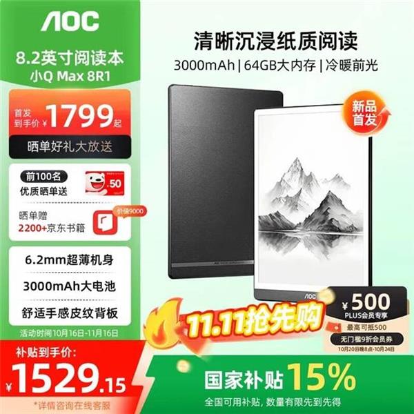 今年双十一,AOC携手京东推出年度最强阅读福利,让真正热爱阅读的人享受一场“理性剁手”。即日起至11月16日,AOC小Q MAX阅读器 8R1限时享受国家补贴15%,到手价低至¥1529起,PLUS会员还可叠加最高500元优惠券,再享额外折上折礼遇。前100名优质晒单用户可获赠50元京东E卡,更有全员尊享的京东精选电子书资源,一次解锁完整阅读生态。对于期待已久的读者来说,这是年度最值得入手的时刻——不仅是价格的惊喜,更是一次真正意义上的“阅读升级”。库存有限、优惠限时,越早入手越划算。趁热度未散,让AOC小Q MAX阅读器8R1成为你这个冬天最温柔的陪伴。