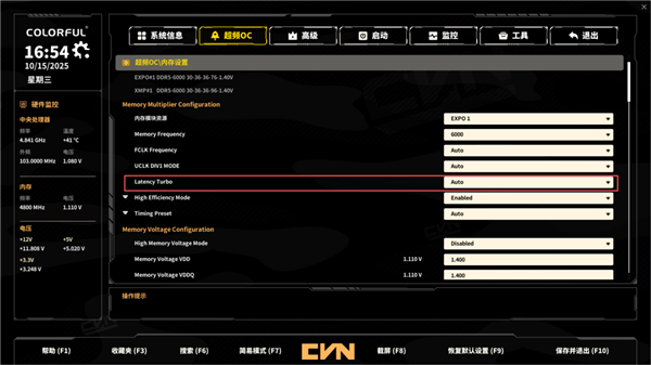 3、开启“内存模块资源”,加载内存自带的“EXPO1”预设