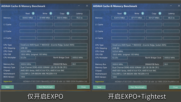 根据七彩虹在AIDA64测试中的对比数据,仅开启EXPO并搭配“紧参”预设后,内存读取提升了5GB/s、写入提升了5.5GB/s、复制提升了4.5GB/s,综合读写性能提升约8%,延迟降低了12ns。