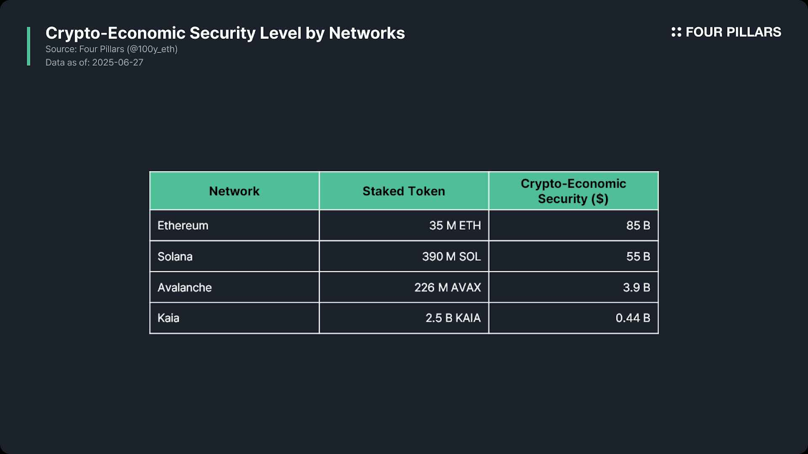以太坊是安全性最高的智能合约网路,截至2025 年6 月27 日,其加密经济安全规模约为850 亿美元,而Solana、Avalanche 和Kaia 的加密经济安全规模分别是为550 亿美元、39 亿美元和4.4 亿美元。以太坊拥有最大的加密经济安全规模,所以最适合大规模稳定币流动性的部署。